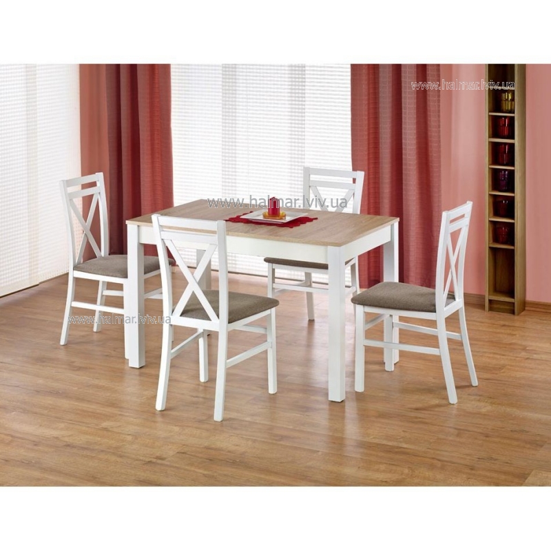 Комплект обеденный HALMAR (стол MAURYCY и стулья DARIUSZ) – стильный комплект для гостиной и столовой польской компании Halmar (Хальмар), состоящий из стола MAURYCY и четырех стульев DARIUSZ. Прямоугольная раздвижная столешница из ламинированной МДФ в цвете дуб сонома. Ножки стола изготовлены из ламинированной МДФ белого цвета, ножки стульев – из массива натурального бука в белом цвете. Сидения и спинки стульев обтянуты мягкой и приятной на ощупь тканью коричневого цвета.